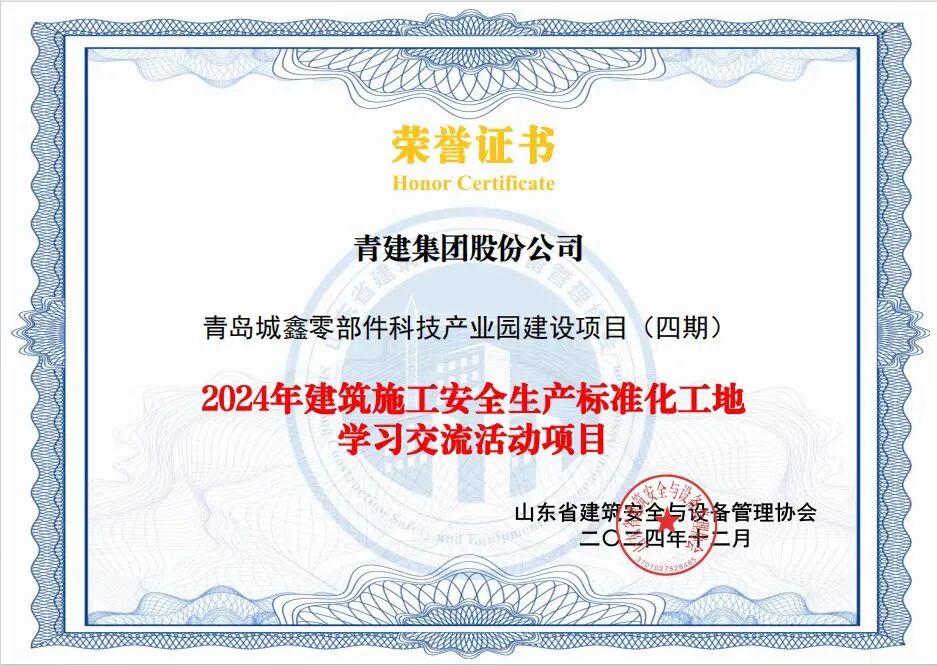 青岛城鑫零部件科技工业园建设项目(四期)被山东省修建清静与装备治理协会评为2024年修建施工清静生产标准化工地学习交流运动项目