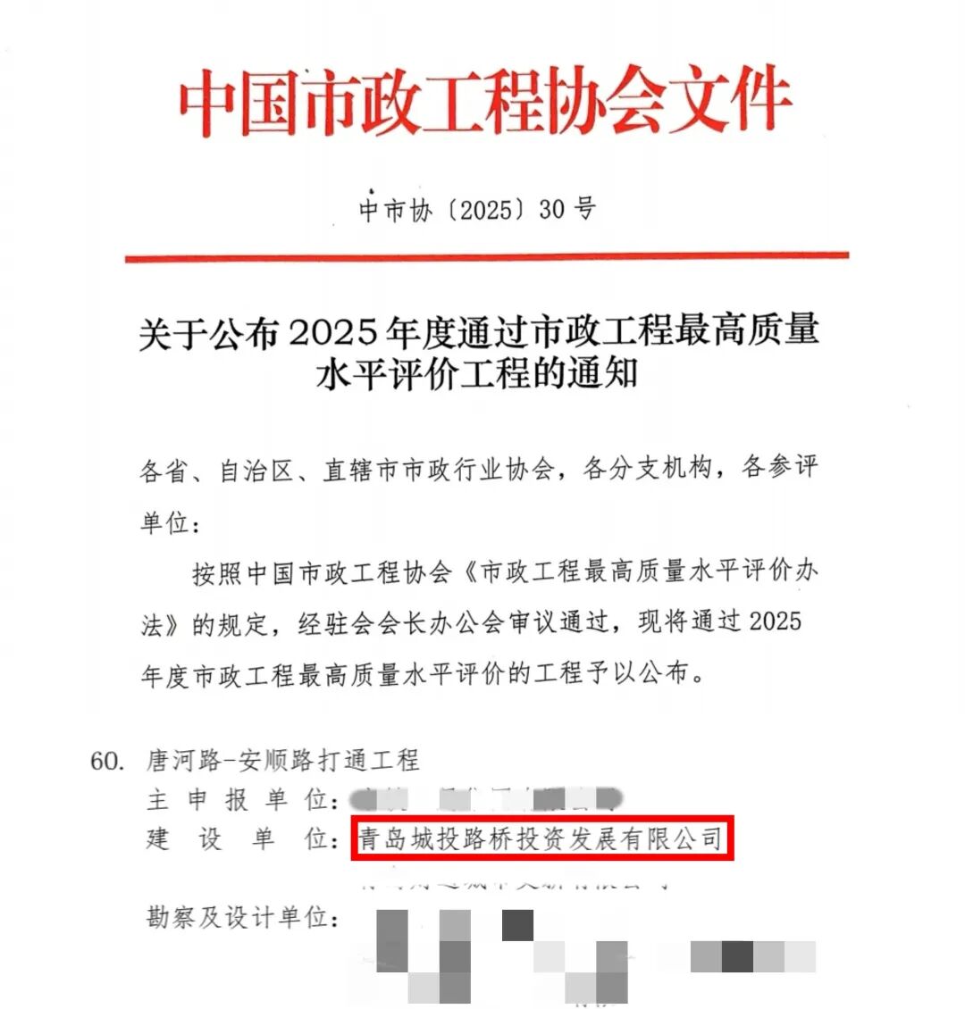 唐河路-安顺路买通工程被中国市政工程协会评为2025年度市政工程最高质量水平评价工程