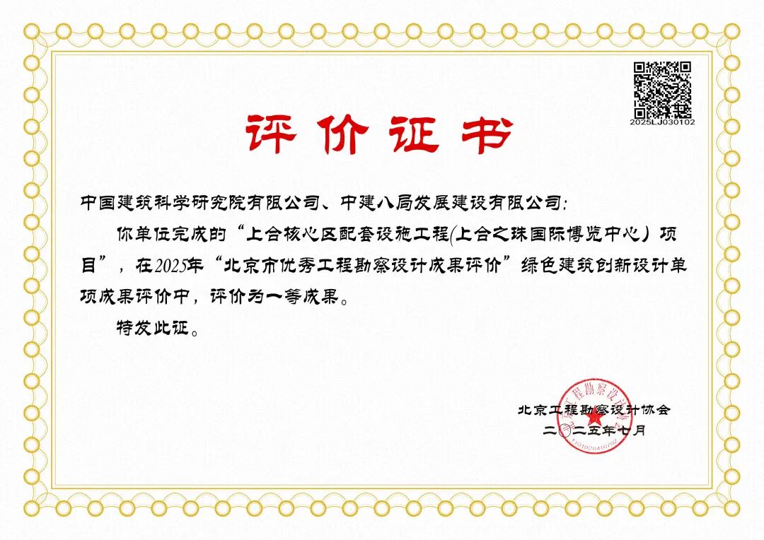 上合之珠国际博览中心项目在2025年“北京市优异工程勘探设计效果评价”绿色修建立异设计单项效果评价中,,,,,评价为一等效果
