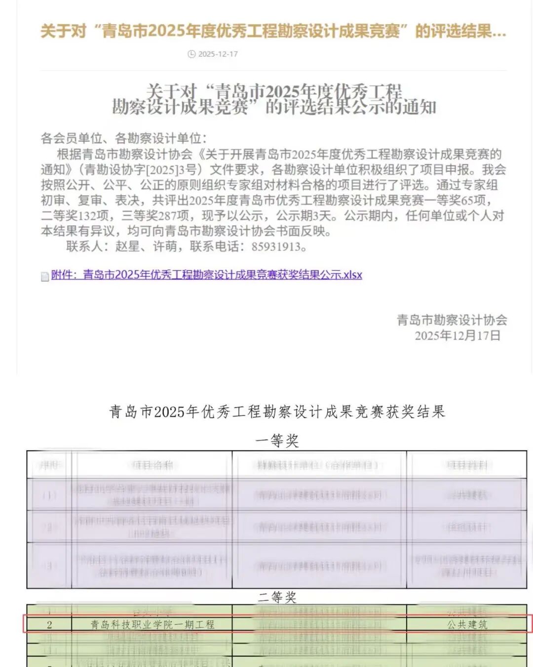 青岛科技职业学院项目被青岛市勘探设计协会评为青岛市2025年度优异工程勘探设计效果竞赛二等奖